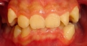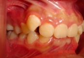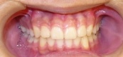 左上側門牙陷在裡面看似缺牙,利用快速低疼痛矯正器將側門牙拉出恢復動人微笑,不需拔牙